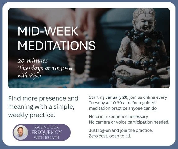 A gentle 20-minute online meditation offered every Tuesday at 10:30am Pacific. This is a free practice open to anyone with no sign-up required and no commitment. No experience required.